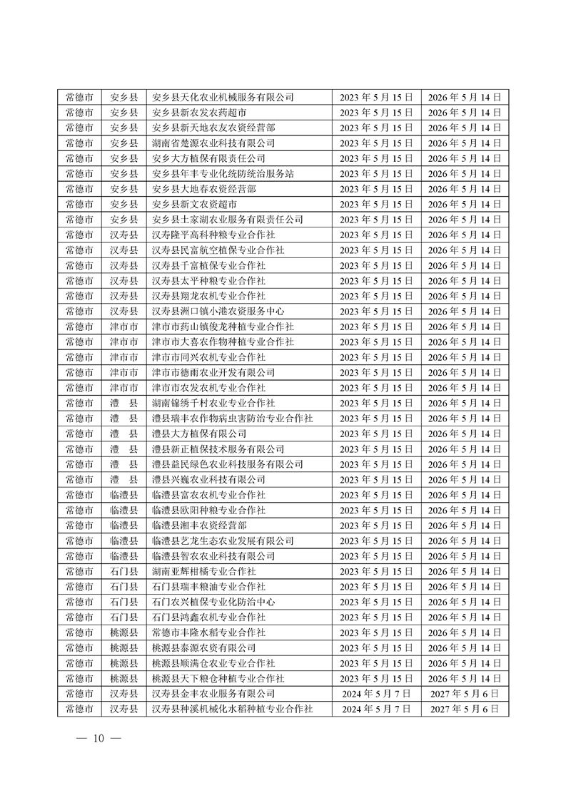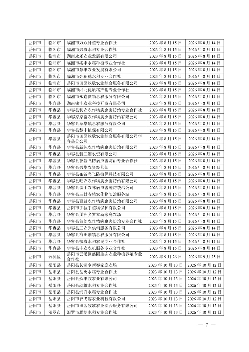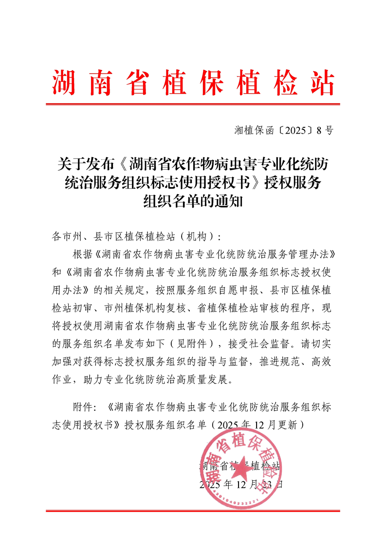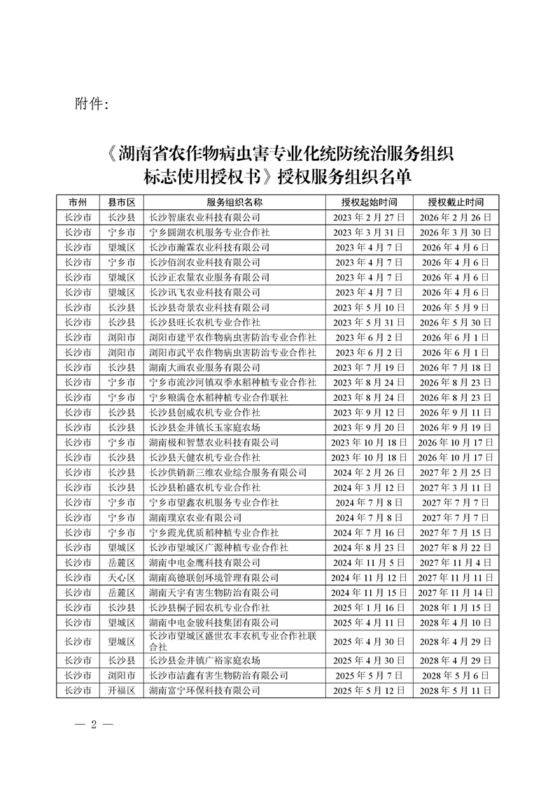 关于发布《湖南省农作物病虫害专业化统防统治服务组织标志使用授权书》授权服务组织名单的通知