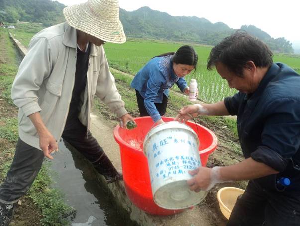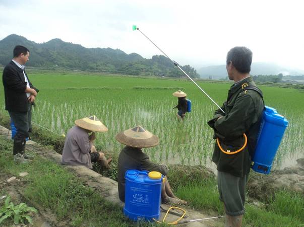 5月10—13日,靖州县普降大雨,稻飞虱大量迁入靖州县域,袁院士的超级稻千公斤攻关项目基地早插大田百蔸有飞虱成虫300—800只,个别田百蔸达1000只。为及早控制稻飞虱危害,防止南方水稻黑矮缩病的发生,确保超级稻千公斤攻关项目顺利实施,5月19日,靖州县鑫隆农民专业合作社及时组织机防队员对该基地进行了第一次施药防治。