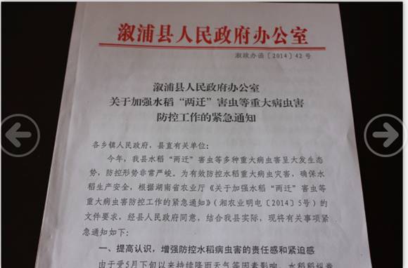 一是组织领导到位。鉴于病虫发生危害的严峻性,溆浦县成立以主管农业副县长莫百生为组长的水稻病虫害防治领导小组,县农业局成立以县农技推广中心主任周立务为组长的水稻病虫害防治技术指导小组;各乡镇也相应成立水稻病虫防治领导小组和技术指导小组,全面指导全县病虫害防治工作,确保各项措施落到实处。7月2日,县委书记蒙汉到岩家垅乡调研中稻病虫防治工作,并提出了具体防治意见。溆浦县人民政府办公室7月3日下发《关于加强水稻“两迁”害虫等重大病虫害防控工作紧急通知》(溆政办函[2014]42号)文件。