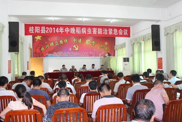 2014年7月23日,桂阳县召开了全县中晚稻病虫害防控工作紧急会议,参加会议的有各乡镇(街道办)农技站站长、专业化统防统治服务组织负责人。会议要求,各乡镇要运用一切宣传手段,紧急动员群众投入到防治工作中去;要加大技术指导服务力度,所有农技人员要全部进村入户、深入田间地头,指导群众正确用药,服务统防统治,确保水稻病虫害得到有效防治。唐和光局长强调:要充分认识当前水稻病虫害大发生形势,提高防范意识,要加强对病虫害防控工作的组织领导与责任落实,要增强责任意识,加强组织协调,植保站及乡镇农技站人员要深入田间地头,做好防治宣传,开展技术指导,提高防治信息入户率。晚稻区要大力推广“治虱防矮、虫病共治”集成技术,全面推进防控工作,提高科学防治水平。