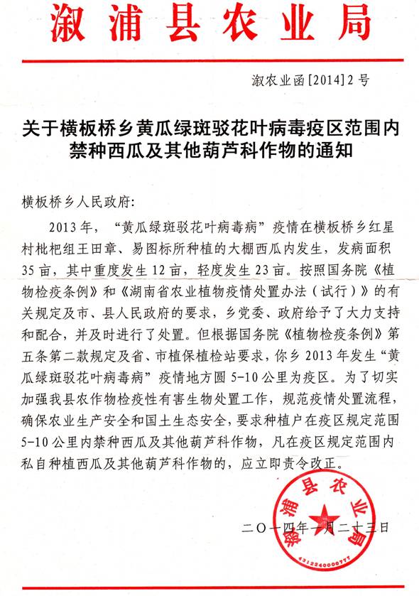 2013年,怀化市沅陵县、溆浦县、鹤城区发生黄瓜绿斑驳花叶病毒疫情,在省站的指导下,通过市县植保植检部门的努力,三地疫情得以及时、彻底扑灭。为做好疫情后续监测工作,严防黄瓜绿斑驳花叶病毒疫情再次入侵,今年,我市元月初就此项工作进行了部置,采取三条主要措施。一是加强监督管理。要求各县市区对辖区西瓜种子经营单位进行深入宣传教育,强调违反植物检疫法律法规应承担的法律责任,要求各经营单位尽量不从浙江等高风险地区调入早佳84-24等高风险西瓜种子,并自觉接受植物检疫执法人员的检查与监督,做到依法调运和经营农作物种子,从源头上杜绝疫情入侵。二是加强宣传引导。对西瓜种植户宣讲黄瓜绿斑驳花叶病毒疫情对生产上造成经济损失的严重性,要求西瓜种植大户一定要从正规渠道购买西瓜种子,并索取购种凭证,确保合法利益不受侵犯。三是加强疫情监测。要求去年发生疫情的沅陵县、溆浦县、鹤城区切实搞好疫区的后续监测工作,采取有效措施严禁在疫区种植葫芦科作物;其它县市区适时做好黄瓜绿斑驳花叶病毒监测工作,发现疑似症状要及时送检。