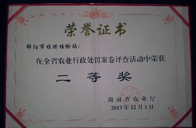一直以来,我市高度注重植物检疫执法案卷规范制作。2013年,我市两份植物检疫执法案卷分别报送农业部和省农业厅参加评选。报送的由邵阳县植保植检站制作的的案卷《张清华无植物检疫证擅自调运杂交水稻种子案》被评为全国农业植物检疫行政处罚优秀案卷;由邵阳市植保植检站制作的案卷《关于邵阳市湘中种业有限公司无植物检疫证书调运杂交水稻种子案》在全省农业行政处罚案卷评查中荣获二等奖。