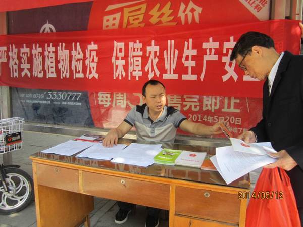 5月12日,溆浦县植保植检站植物检疫人员在县城和重点乡镇组织开展植物检疫宣传活动。为组织开展好本次宣传活动,县植保植检站结合自身工作特点,围绕“普及植物检疫知识,强化疫情监管措施,严防疫情扩散危害,保障农业生产安全”为主题。在人流量多的城区和主要乡镇集市上设立现场咨询点进行现场咨询,重点对《植物检疫条例》、《植物检疫条例实施办法(农业部分)》、《植物检疫知识百题问答》及该县有哪些植物检疫对象和防控方法进行了讲解和解释。还向广大市民发放了植物检疫等有关宣传资料1000余份,有力的向广大公众宣传了植物检疫法规常识,普及了疫情防控知识。