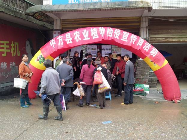 9月23-29日,中方县植保站全体工作人员在分管领导的带领下,认真开展以“普及植物检疫知识、强化检疫监管力度、严防疫情扩散危害、保障农业生产安全”为主题的“全国植物检疫宣传周”活动。此次活动分别在桐木镇、牌楼镇、泸阳镇、中方镇四个乡镇设立植物检疫宣传活动咨询点,出动宣传车3次,发放检疫宣传资料1500余份,现场咨询800余人次,悬挂横幅4条,张贴各种标语45张,县电视台进行了新闻报道。