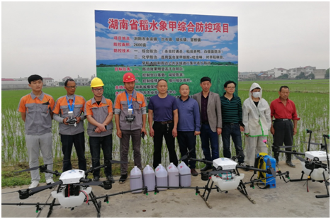 自2018年起浏阳市通过政府购买服务的方式,在永安、沙市、镇头、官桥等重发区实施稻水象甲综合防控。通过第一年的综合防控,2019年稻水象甲基数明显降低,防控成效显著。为巩固防控效果,进一步降低稻水象甲可能带来的损失,5月14日,永安镇坪头村打响了今年稻水象甲综合防控的第一枪。三台植保无人机有序飞过稻田上空,准确喷洒防治药剂,防治区域还包括了大田周边的公共区域。