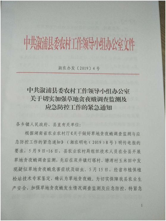 灾害发生后,溆浦县委、县政府高度重视,中共溆浦县委农村工作领导小组立即印发《关于加强草地贪夜蛾调查监测与应急防控工作的紧急通知》,并印发草地贪夜蛾幼虫识别、危害症状、发生趋势及防治建议宣传挂图530份,要求各乡镇立即开展监测预警和应急防控。
