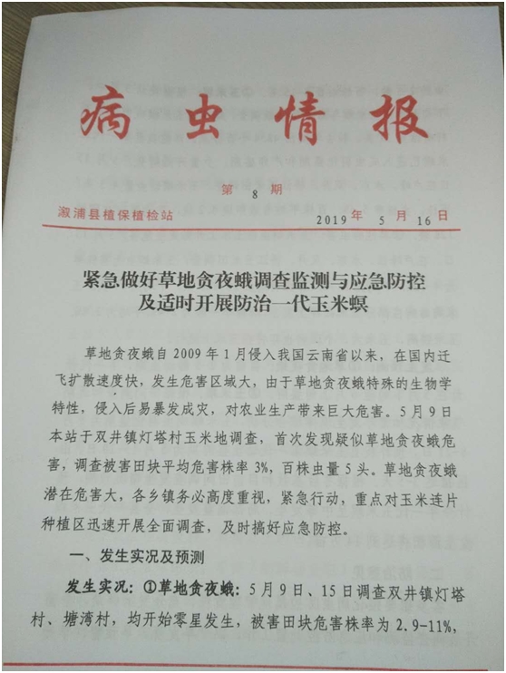 草地贪夜蛾自2019年1月入侵我国云南省以来,在国内迁飞扩散速度快,发生危害区域大。溆浦县5月9日、5月22日在双井镇灯塔村、桥江镇德垅湾村相继发现草地贪夜蛾。