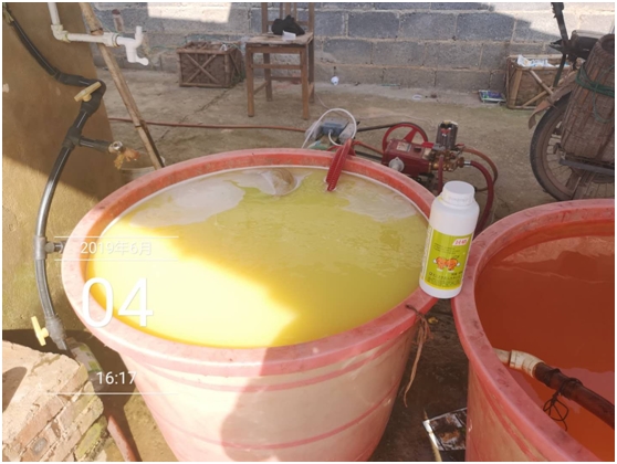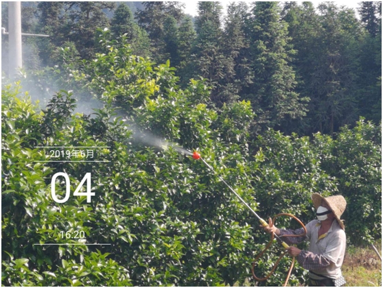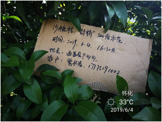 6月4日,通道县植保植检站在万佛山镇下乡园艺场、陇城镇东江村开展药剂控制柑橘夏梢诱捕柑橘木虱试验。两个试验点柑橘品种分别为砂糖橘、晚熟椪柑,面积各10亩,采用氟节胺500倍在夏梢开始萌发时喷施柑橘枝梢生长点(在每个试验点的四周和中心位置各留1-3株柑橘不喷药),20天后再喷施一次,通过抑制夏梢萌发来恶化柑橘木虱取食条件,诱使木虱去未控梢的柑橘植株上取食,然后对在未控梢柑橘植株上取食木虱施药灭杀。控夏梢的另一个好处就是减少了橘农人工抹夏梢的麻烦和开支。