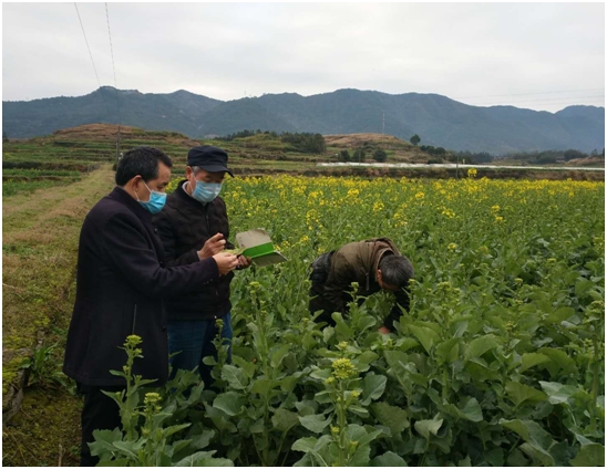 近日,中方县植保工作人员深入“稻油水旱轮作”项目基地,一边调查油菜病虫害发生实况,一边宣传新冠疫情防控知识,指导农户在新冠疫情防控的非常时期,适时开展油菜菌核病防控。