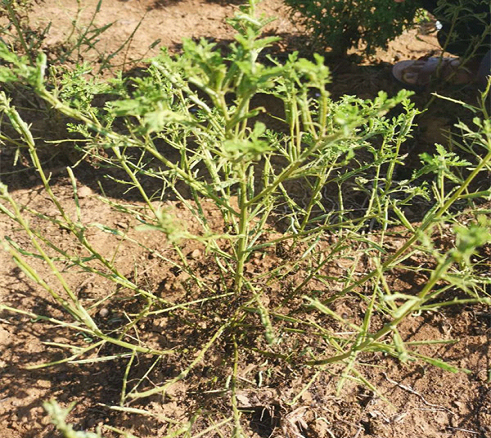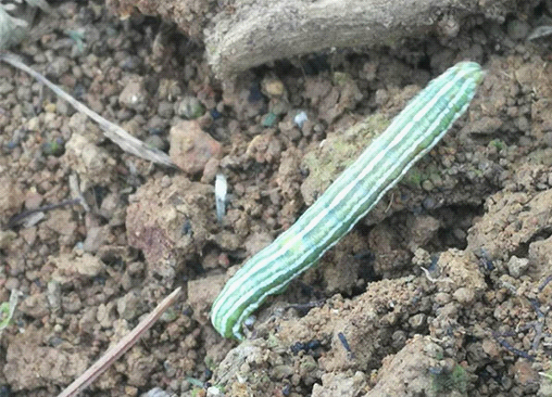 8月16日,冷水滩区农业农村局接到黄阳司镇水口桥村支书来电反映,在该村扶贫产业青蒿上发现有大量不明青虫啃食青蒿叶片,为害较重,若不及时防治会造成青蒿失收。区农业农村局立即安排区植保植检站技术员前往查看。据现场调查,在该村委会办公楼周围约200亩青蒿上发生青虫为害,且虫量极大,虫量一般为30—100头/株,个别植株已被吃成光杆。因青蒿往年很少见虫害,此青虫是首见,区植保站技术员将青虫拍照发给湖南农大黄教授,得到他的初步确认是金棒鬚夜蛾的幼虫,3龄以上幼虫具暴食性,为害大。