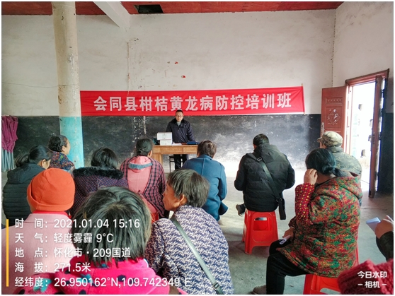 此次培训由县植保植检站站长吴声海授课,授课内容为柑橘黄龙病为害的严重性、病害识别和防控要点、药剂选择及柑橘防冻等,现场还发放柑橘黄龙病防控技术资料50余份,悬挂宣传横幅9条。