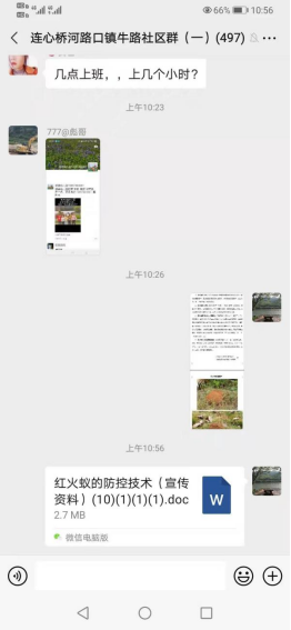 一是通过纸质资料入户、村连心桥微信群等宣传方式,让广大群众识别红火蚁、了解红火蚁、掌握红火蚁防控方法。