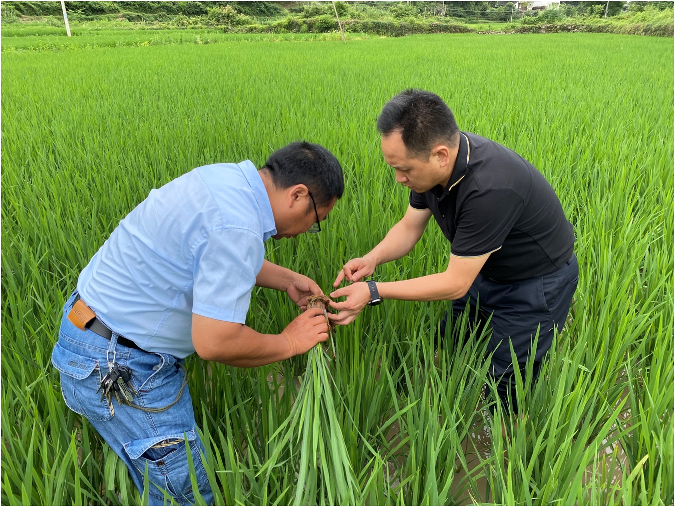 7月2日,怀化市农业综合服务中心植保植检站张龙杰、周新文就辰溪县当前水稻病虫害防控等植保植检工作进行调研。