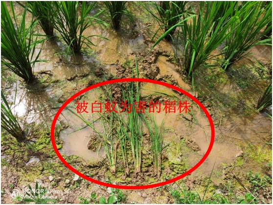 7月13日上午,洪江市农业农村局植保植检室接到江市镇一农户的“求救”电话,说稻田中有水稻不明原因枯死。在这粮食生产的关键时期,植保室成员协同主任立即出动赶往现场。经田间调查,发现枯死水稻根系全遭破坏,无病理性烂根现象,经仔细观察,竟是白蚁所害。植保技术人员立即给农户开出“处方”,深水覆田,赶走白蚁,及时解决了农户的疑难困惑,得到了群众的好评。