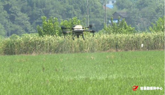 在网岭镇种田大户杨曼娇的水稻基地里,植保站的技术人员指导她采用无人植保机喷洒农药,一个小时可以作业80亩水稻,既有效防止了人员聚集,又省时省工。