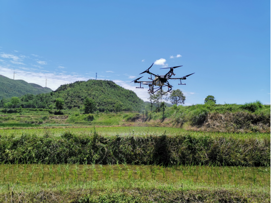 2021年6月11日,专业化防治组织在吉卫镇开展稻水象甲统防纺治