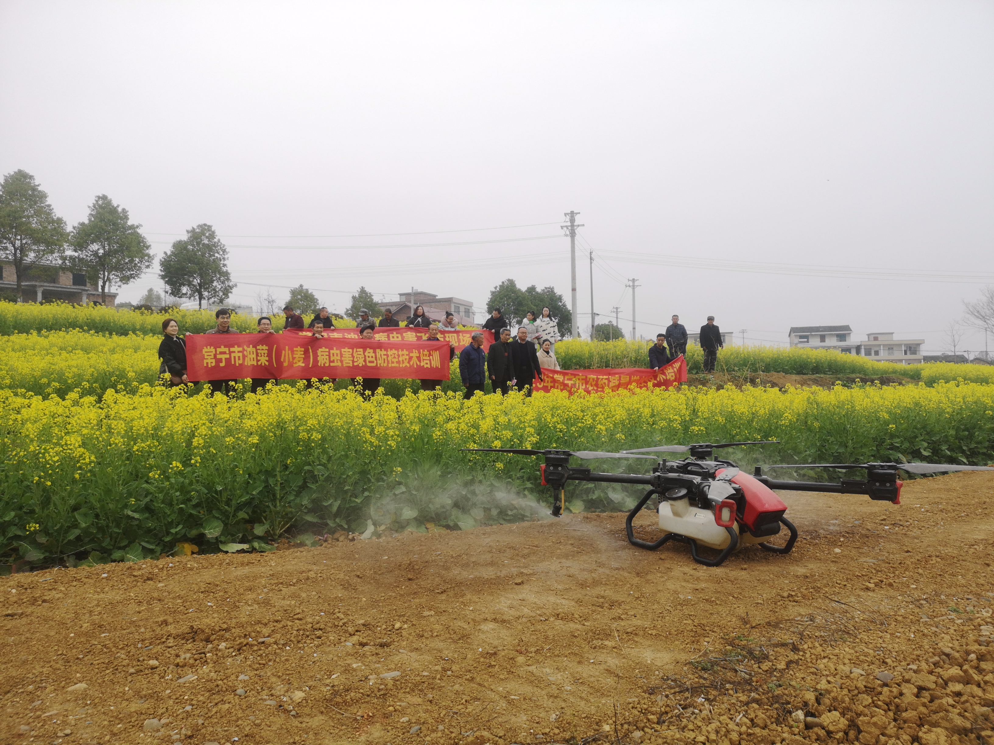观摩油菜病虫统防统治植保无人机作业
