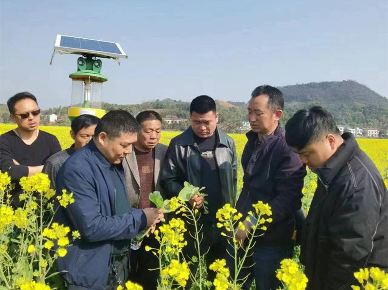 此次培训,选择在油菜生产具有代表性的云岩社区示范基地进行。在省植保植检站指导下,该基地集成了统一良种、种子处理、昆虫食(性)诱、优先使用生物农药和严控化学农药等先进技术,种植油菜1500多亩。培训首先由植保专家现场指导学员识别油菜主要病虫害的特征特性,介绍绿色高效防控方法,接着,结合田间现状,由学员提问,专家现场解答,最后,4台无人机现场演示了油菜“一喷多防操作技术。