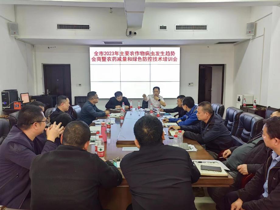 4月7日,怀化市召开2023年主要农作物病虫害发生趋势会商暨农药减量和绿色防控技术培训会,各县市区植保植检站站长和测报人员参加会议。