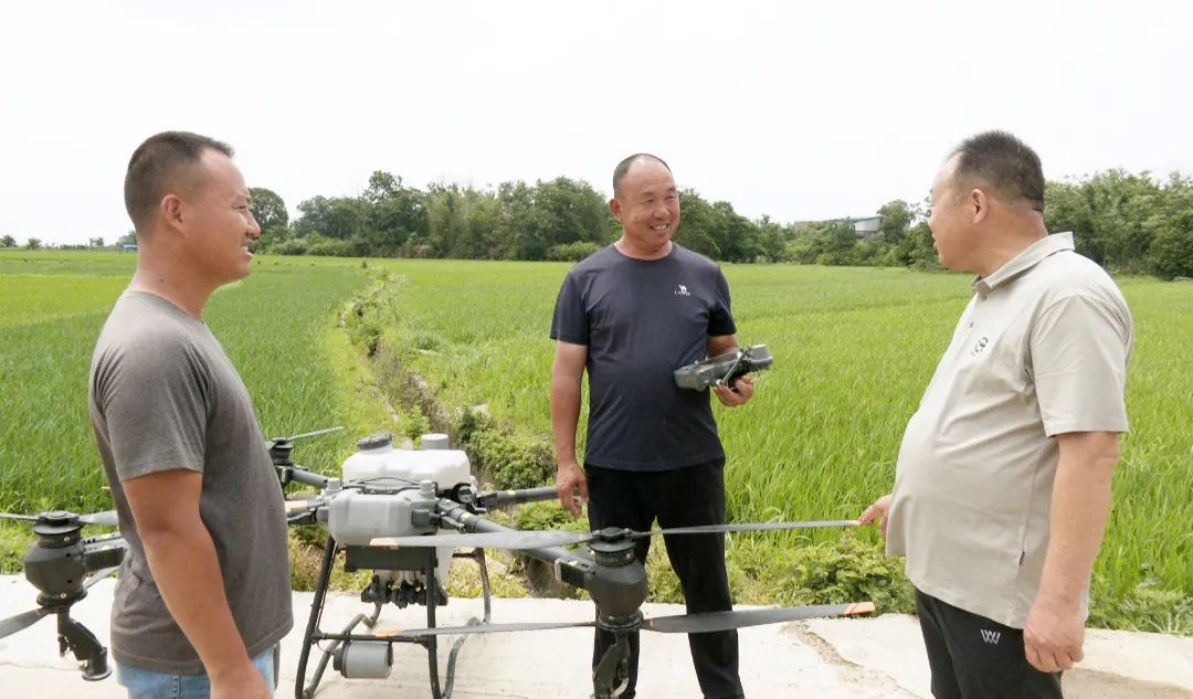 在君山区许市镇凉亭村的一处连片稻田里,两架植保无人机在技术人员的操作下稳稳起飞,来回穿梭于水稻田间,将药物均匀地喷洒在水稻叶面上,不到半小时就完成了100多亩水稻的防治喷洒作业。 据了解,这种无人机操作非常简单,只需要通过遥控手柄规划好要喷洒的区域及路线就能一键作业,撒药施肥十分均匀,不仅能有效地防治病虫害,节约人工成本,更有利于农户的田间管理,极大程度上保障了农作物丰产丰收。
