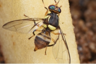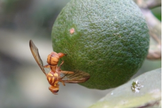 我站在文昌、茶铺、高沙、雪峰等乡镇(街道、管理区)桔园调查:早、中熟桔园均出现落果及未熟先黄虫果,主要是柑桔大、小实蝇(以下简称实蝇,附图)的危害造成的,被害果表现为未熟先黄,果内有大量实蝇幼虫(俗称“蛆”),平均落果率为2.1%,管理粗放及防控不力的部分桔园落果率达16.3%以上,我县实蝇总体发生程度仍属偏重发生。