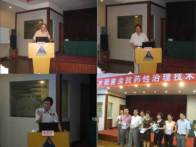 针对当前水稻害虫抗药性上升,用药量逐年增大的实际情况,8月29日,全国农技中心与公益性行业(农业)科研专项作物害虫抗药性监测与治理技术示范与推广(201203038)项目组联合在江苏省扬州市召开水稻害虫抗药性治理技术研讨会,中国农业大学、南京农业大学、华中农业大学、西南大学、贵州大学、湖南农业大学、中国农科院植保所、湖北省农科院植保所等15家科研单位的专家,江苏、安徽、浙江等南方11个水稻主产省植保站代表以及承担示范任务的示范县技术人员共120多人参加了本次会议。会议一是观摩了位于扬州市邗江区的水稻主要害虫抗药性治理技术示范区以及不同作用机理水稻杀虫剂田间药效试验示范现场;二是项目首席专家中国农业大学高希武教授及南京农业大学韩召军教授、华中农业大学李建洪教授等7位专家分别报告了有关水稻重大害虫稻飞虱、螟虫抗药性发展动态及关键抗药性治理技术措施,交流了水稻新型杀虫剂双酰胺类、新烟碱类杀虫剂研发动态与使用技术,总结了项目前期取得的一些成果;三是开展了水稻害虫安全用药技术培训,免费为基层植保技术人员和专业化防治组织技术人员发放了有关的书籍和挂图。