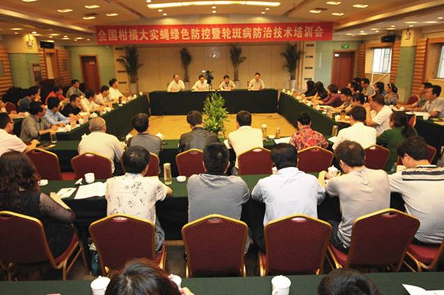 柑橘大实蝇是一种隐蔽性强、成虫飞翔能力强、防治困难的一种害虫,近年来在我国柑橘产区扩散蔓延、危害加重。2009年6月4日,农业部已将柑橘大实蝇从全国农业植物检疫性有害生物名单中取消。2010年4月份在宜昌举办的全国柑橘实蝇防控技术培训班上成立了“全国柑橘实蝇防治协作组”,计划通过3-5年的技术攻关和示范推广,有效地控制柑橘大实蝇的发生和危害。2013年全国农技中心将柑橘大实蝇绿色防控列为体系创新项目。此次培训班结合体系创新项目实施的要求,就柑橘大实蝇的绿色防控技术规范和技术宣传挂图制作进行了充分研讨,修改完善并形成了技术规范初稿和挂图制作提纲。