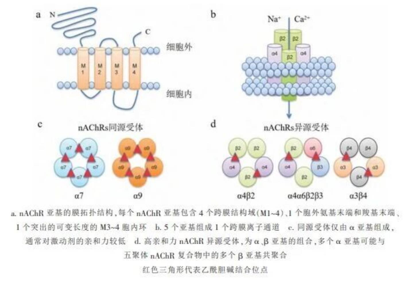 构成乙酰胆碱受体的亚型由组成它的亚基数量命名,例如(α4)2(β2)3 表示该亚型由2个α4和 3个β2组成。当研究中不清楚亚型的具体组成时,可能会使用星号加以标注,例如α4β1*表示该亚型组成有α4和β1,但同时可能还包含其他亚基类型。由此,烟碱型乙酰胆碱受体分为由同一亚基组成的同型五聚体和由不同亚基组成的异型五聚体。异型五聚体又因组成亚基是否同源分为同源异型五聚体(由不同的α亚基组成)和非同源异型五聚体(由α和非α亚基组成)。