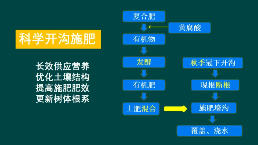 (二)施用方法——壕沟施肥。1、时间:秋梢停长后、第三次根系生长高峰前;2、位置:树冠滴水线附近,壕沟内需出现小骨干根,剪平;3、规格:壕沟深、宽均为35cm,长度100cm;4、施肥:肥料和土壤混匀,再回填入壕沟;5、施量:全年施肥量的75%,有机+无机+生物;6、材料:枯饼、有机肥(畜禽粪便)、稻草(烟渣、秸秆等)、适量复合肥等;混合发酵以后肥效更好,持效性好。