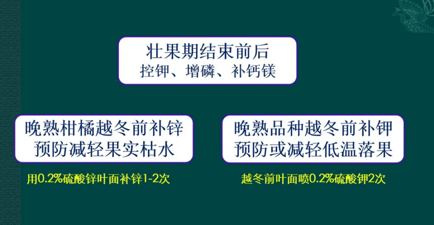 晚熟柑桔入冬前补钾,大幅度减少冬季落果,钾元素正常(1.0%—1.5%),即使果实冻伤也很少落果。可以采用土壤浇施与叶面喷施结合,提高钾肥吸收率,抵御冬季寒害和减轻落果损失。