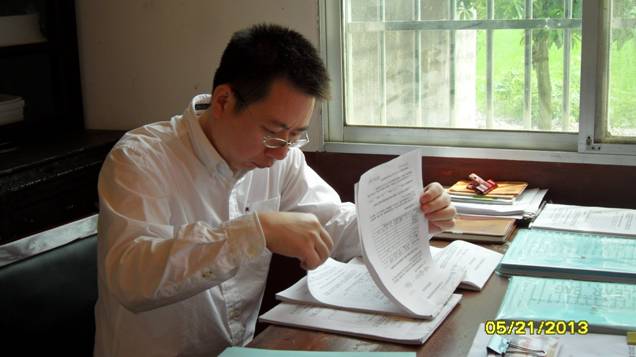 省站陈越华副科长在天鹅村级服务站查看全程承包合同签约情况