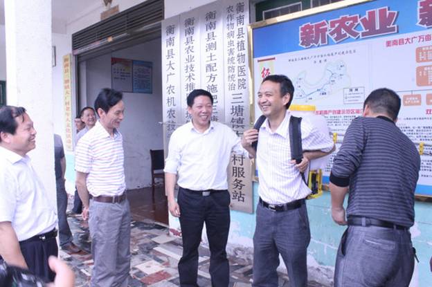 2013年5月14日至15日,省植保植检站欧站长一行在衡阳市农业局局长汪维、副局长曾向国、副调研员唐春生等同志的陪同下,对衡山、衡阳、衡南三县农作物病虫害专业化统防统治和稻水象甲防控工作进行了督查调研。