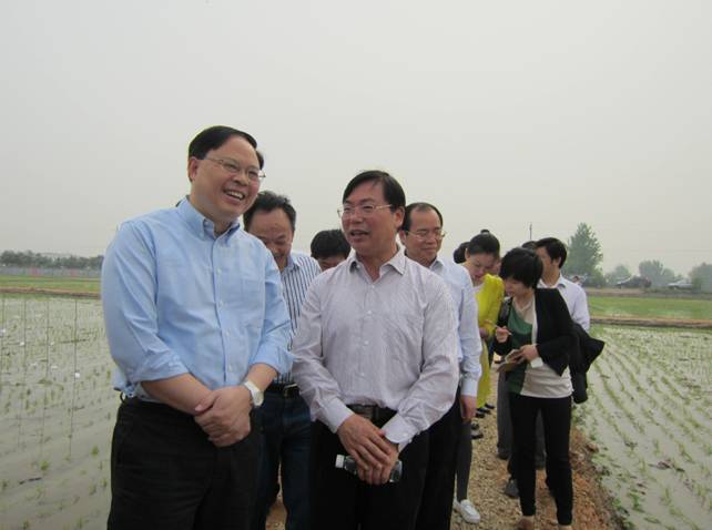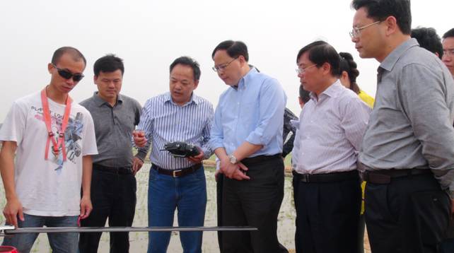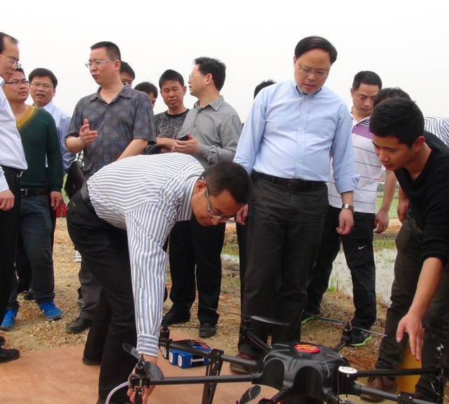 4月17日上午,长沙市委副书记、市长张剑飞和省农机局长王罗方一行到望城区调研农业生产。在区委书记谭小平、区长孔玉成等陪同下,来到望城区新康乡金成水乡基地观摩了植保无人机飞控参数测试试验。